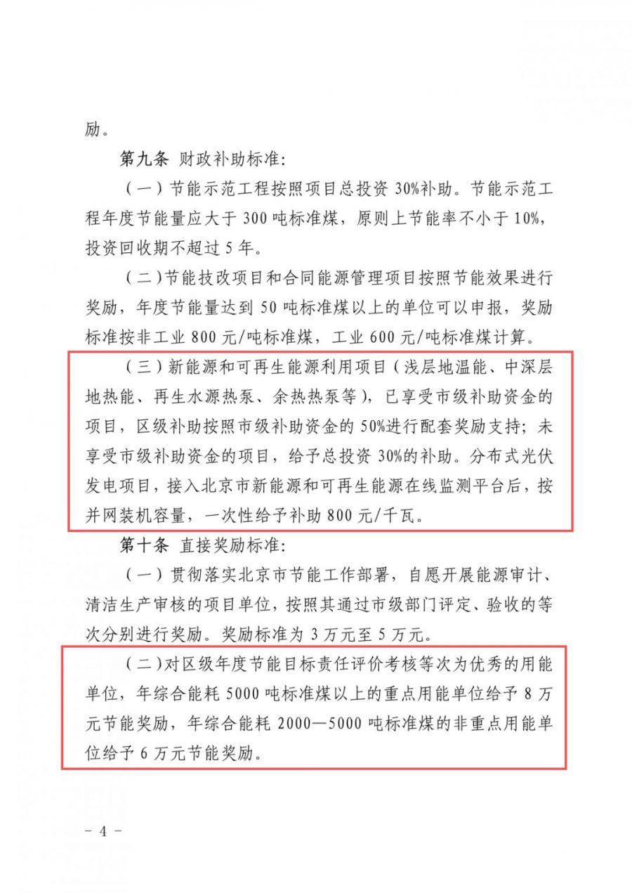 通知明確:新能源和可再生能源利用項(xiàng)目已享受市級(jí)補(bǔ)助資金的項(xiàng)目,區(qū)級(jí)補(bǔ)助按照市級(jí)補(bǔ)助資金的50%進(jìn)行配套獎(jiǎng)勵(lì)支持;未享受市級(jí)補(bǔ)助資金的項(xiàng)目,給予總投資30%的補(bǔ)助。分布式光伏發(fā)電項(xiàng)目,接入北京市新能源和可再生能源在線(xiàn)監(jiān)測(cè)平臺(tái)后,接并網(wǎng)裝機(jī)容量,一次性給予補(bǔ)助800元/千瓦。