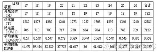 前后相比,10天供水量幾乎相等,而耗電減少1720KWH,平均單耗降低0.136KWH,節(jié)電率24.37%,平均時耗降低9.942KW/H,節(jié)電率25.37%,平均節(jié)電率達24.87%,節(jié)電效果顯著。