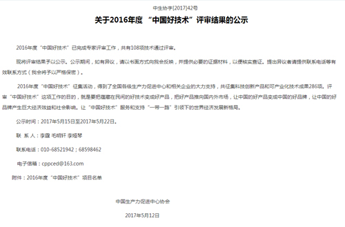 “中國(guó)好技術(shù)”是為深入貫徹落實(shí)黨中央、國(guó)務(wù)院關(guān)于實(shí)施創(chuàng)新驅(qū)動(dòng)發(fā)展戰(zhàn)略和“大眾創(chuàng)業(yè)、萬眾創(chuàng)新”的精神,不斷激發(fā)全社會(huì)的創(chuàng)新創(chuàng)業(yè)活力,營(yíng)造全民創(chuàng)新的良好氛圍,由中國(guó)生產(chǎn)力促進(jìn)中心協(xié)會(huì)同國(guó)家相關(guān)機(jī)構(gòu)和企業(yè)共同發(fā)起和舉辦的,此獎(jiǎng)項(xiàng)評(píng)選為每年一次。在2016年度“中國(guó)好技術(shù)”征集中,得到了全國(guó)各級(jí)生產(chǎn)力促進(jìn)中心和相關(guān)企業(yè)的大力支持,共征集科技創(chuàng)新產(chǎn)品和可產(chǎn)業(yè)化技術(shù)成果286項(xiàng),獲得“中國(guó)好技術(shù)”稱號(hào)有108個(gè)項(xiàng)目。評(píng)審“中國(guó)好技術(shù)”這項(xiàng)工作的目的,就是要把蘊(yùn)藏在民間的好技術(shù)變成好產(chǎn)品,把好產(chǎn)品推向國(guó)內(nèi)外市場(chǎng),讓中國(guó)的好產(chǎn)品變成中國(guó)的好品牌,讓中國(guó)的好品牌產(chǎn)生巨大經(jīng)濟(jì)效益和社會(huì)影響。讓“中國(guó)好技術(shù)”服務(wù)和支持“一帶一路”引領(lǐng)下的世界經(jīng)濟(jì)發(fā)展新格局,讓“中國(guó)好技術(shù)”走出國(guó)門,走向世界。