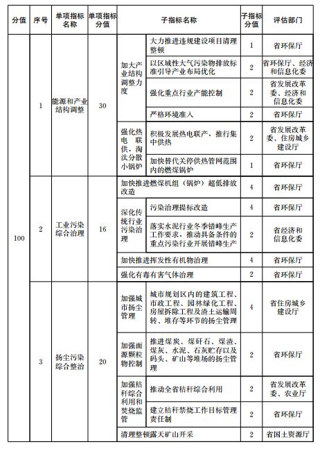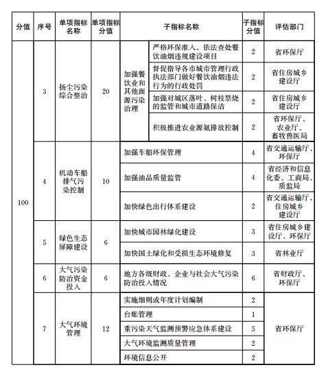 大氣污染防治重點任務(wù)完成情況包括能源和產(chǎn)業(yè)結(jié)構(gòu)調(diào)整、工業(yè)污染綜合治理、揚塵污染綜合整治、機(jī)動車船排氣污染控制、綠色生態(tài)屏障建設(shè)、大氣污染防治資金投入、大氣環(huán)境管理等7項指標(biāo)。大氣污染防治重點任務(wù)完成情況各指標(biāo)的定義、評估要求和計分方法等由有關(guān)評估部門按照《二期行動計劃》的職責(zé)分工確定,評估部門根據(jù)子指標(biāo)分值對各市重點任務(wù)進(jìn)行打分,并向省環(huán)保廳提供評分結(jié)果。評估部門為兩個部門以上的,各評估部門分別打分后取平均值作為本項重點任務(wù)得分。