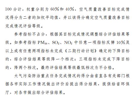 第四條評估采用評分法,空氣質(zhì)量改善目標(biāo)完成情況和大氣污染防治重點任務(wù)完成情況滿分均按滿分100分計,綜合評估結(jié)果為二者的加權(quán)平均值,權(quán)重分別為60%和40%。評估結(jié)果分為優(yōu)秀、良好、合格、不合格四個等級,其中,評分結(jié)果90分及以上為優(yōu)秀、70分(含)至90分為良好、60分(含)至70分為合格、60分以下為不合格。根據(jù)參考指標(biāo)目標(biāo)完成情況調(diào)整綜合評估結(jié)果等級作為最終評估結(jié)果。參考指標(biāo)PM10、SO2、NO2中任意一項指標(biāo)反彈10%及以上或有任意兩項指標(biāo)未完成《二期行動計劃》確定的下降目標(biāo)的,綜合評估結(jié)果等級降一個檔次;三項指標(biāo)未完成下降目標(biāo)的,降兩個檔次。最終評估結(jié)果等級最低檔次為不合格。