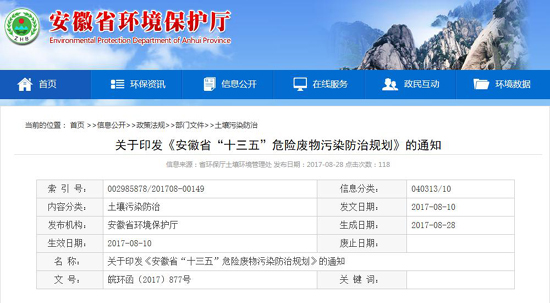 關于安徽省“十三五”危險廢物污染防治的具體要求