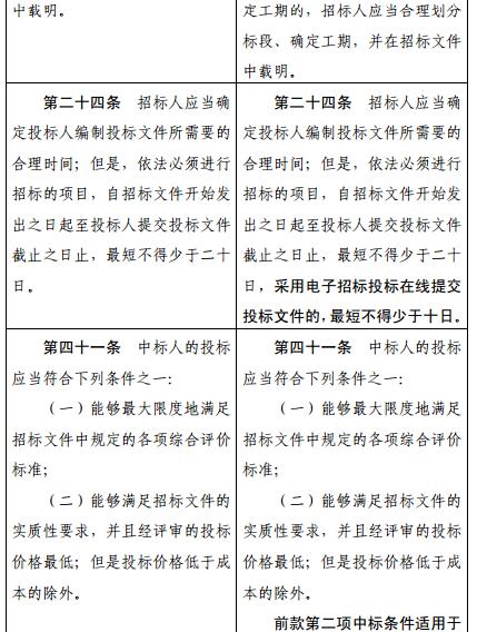 五、將第二十四條修改為:“招標(biāo)人應(yīng)當(dāng)確定投標(biāo)人編制投標(biāo)文件所需要的合理時(shí)間;但是,依法必須進(jìn)行招標(biāo)的項(xiàng)目,自招標(biāo)文件開(kāi)始發(fā)出之日起至投標(biāo)人提交投標(biāo)文件截止之日止,最短不得少于二十日,采用電子招標(biāo)投標(biāo)在線(xiàn)提交投標(biāo)文件的,最短不得少于十日?!?/p>