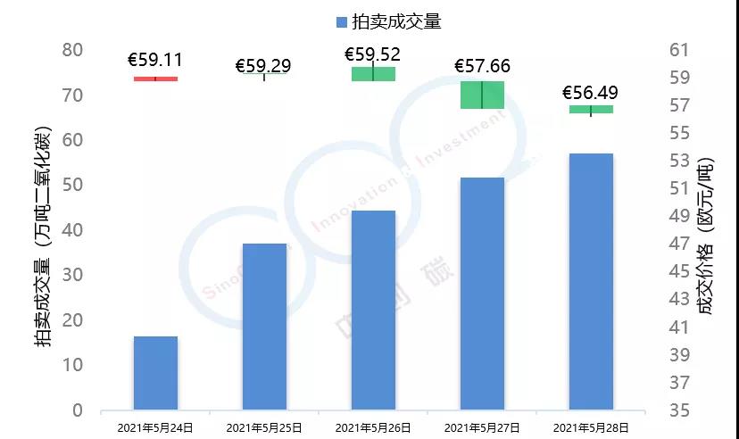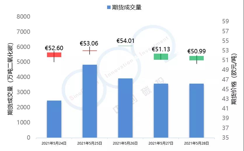 2021年5月24日至5月28日,由于全球能源市場(chǎng)表現(xiàn)較為疲軟,市場(chǎng)投資者對(duì)于配額需求的預(yù)期不景氣,歐盟碳市場(chǎng)在本周總體呈現(xiàn)下跌趨勢(shì),在本周三漲至53.59歐元/噸的頂峰后,隨即下跌近5個(gè)點(diǎn),最終收于50.95歐元/噸,回落至接近本月初水平。英國(guó)碳市場(chǎng)自上周三開市后,在本周迎來交易的第一個(gè)整周,在短期試探了59.52歐元/噸的碳價(jià)后,英國(guó)碳價(jià)逐步回落至56.49歐元/噸,該趨勢(shì)與歐盟碳市場(chǎng)基本保持一致。本周歐盟碳市場(chǎng)期貨成交量達(dá)到1.84億噸,配額拍賣量為平均每天300萬噸左右。英國(guó)碳市場(chǎng)本周拍賣成交量達(dá)到207萬噸。據(jù)悉,英國(guó)政府正在考慮增加2021年英國(guó)碳市場(chǎng)配額的拍賣供應(yīng)。