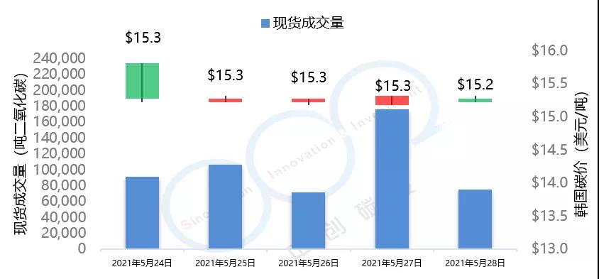 2021年5月24日至5月28日,本周韓國(guó)碳價(jià)延續(xù)上周的下跌趨勢(shì),由15.3美元/噸下跌至15.2美元/噸。本周韓國(guó)碳市場(chǎng)成交量達(dá)到52萬噸,遠(yuǎn)高于上周7萬噸的水平。