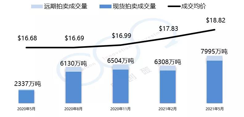 加州-魁北克碳市場(chǎng)的初始配額發(fā)放以拍賣為主,每個(gè)季度舉行一次拍賣。2021年5月的第27次拍賣均價(jià)與總成交量創(chuàng)歷史新高。拍賣均價(jià)為18.82美元,較上一季度漲幅為5.6%,總成交量為7995萬噸。以下是由中創(chuàng)碳投統(tǒng)計(jì)的加州-魁北克碳市場(chǎng)近一年的交易情況。