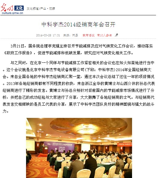 與之同時,在北京一個同樣與節(jié)能減排工作緊密相關(guān)的會議也在如火如荼地進行當(dāng)中。這個會議就是北京中科宇杰節(jié)電設(shè)備有限公司(下稱:中科宇 杰)2014年全國經(jīng)銷商大會。來自全國各地的中科宇杰經(jīng)銷商匯聚一堂,通過本次會議總結(jié)了過往一年的項目情況。2013年各地經(jīng)銷商都有不同程度的收 獲,來自浙江金華的黃博士與山西介休的孫總代表經(jīng)銷商進行了精彩的發(fā)言。黃博士與孫總分別針對目前國內(nèi)的節(jié)能減排市場情況進行了分析,并把自己的成功經(jīng)驗 與大家進行了分享,大大鼓舞了各地經(jīng)銷商的士氣。與經(jīng)銷商代表發(fā)言交相輝映的是員工代表的分享,展示了中科宇杰團隊良好的精神面貌與強大的戰(zhàn)斗力。