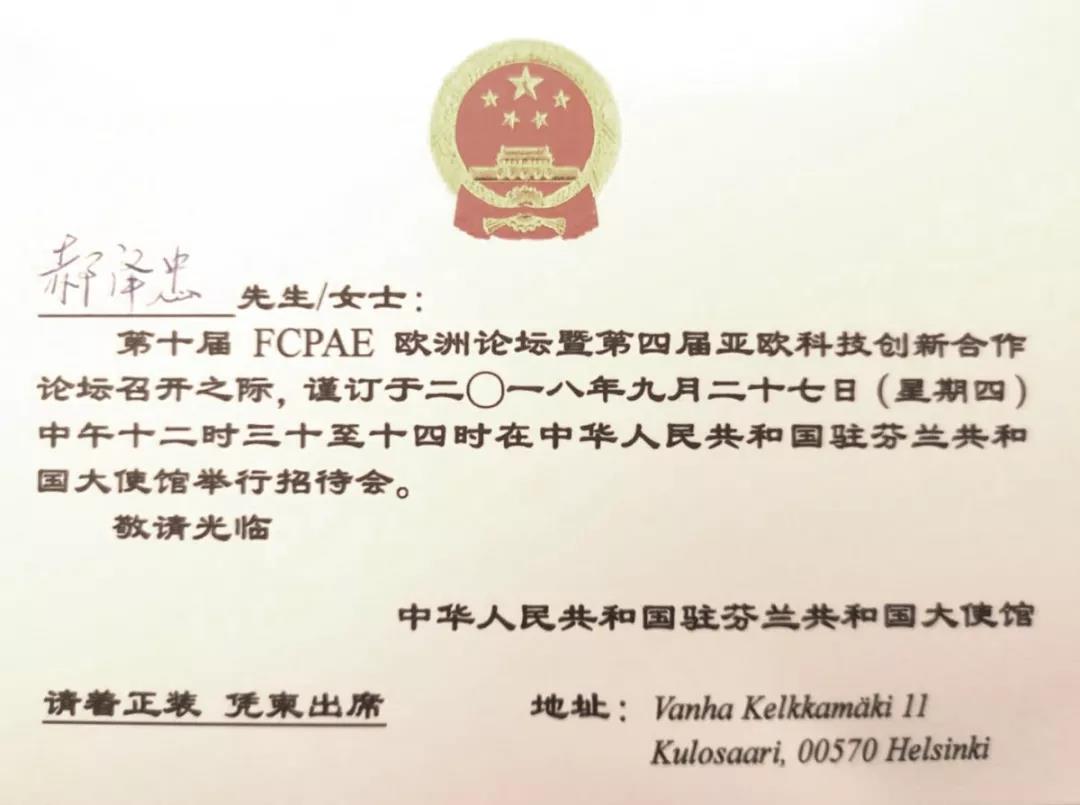 全球公益系列活動(dòng)在芬蘭傳遞期間正值第十屆FCPAE歐洲論壇暨第四屆亞歐科技創(chuàng)新合作論壇在芬蘭赫爾辛基召開,倡導(dǎo)環(huán)保節(jié)能低碳的公益活動(dòng)得到了論壇舉辦方以及中國駐芬蘭大使館的廣泛關(guān)注和大力支持,以中科宇杰董事長郝澤忠為代表的宣傳團(tuán)一行受邀出席中國駐芬蘭大使館招待會(huì)。
